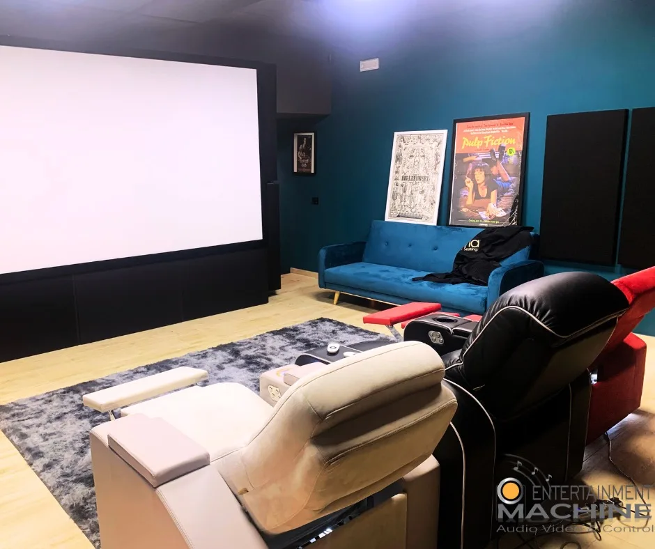 Iniziamo dalla sala cinema, ci sono due impianti fissi installati in wall e posizionati dietro lo schermo che è fonotrasparente, come nei cinema.