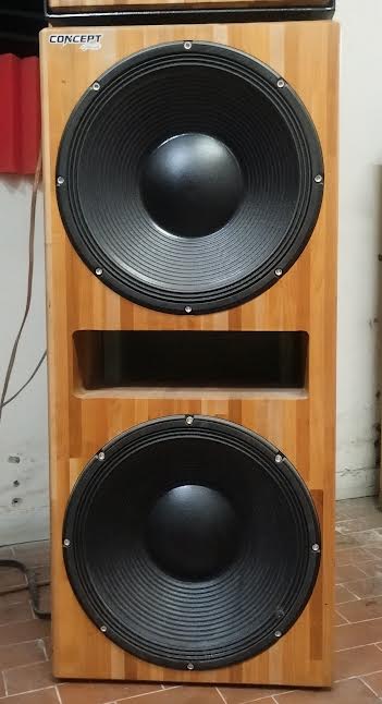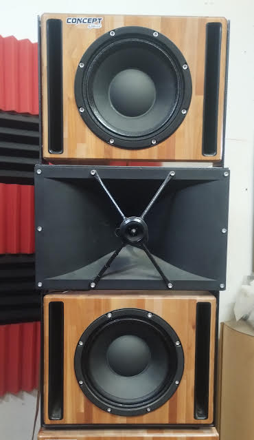 Ma torniamo al Concept, il sistema si compone di due torri modulari in legno lamellare a quatto vie, alte quasi 2 metri, con 2 woofer da 15”, 2 mid-bass da 10” che lavorano in volumi separati e diversi come litraggio, un midrange a tromba ed un bullet tweeter, più 2 subwoofer da 370 litri, contenenti ciascuno 2 componenti da 16” a lunga escursione, equivalenti ad un 30”, in grado di movimentare quasi 4 litri d’aria in condizioni lineari e quasi 7 entro i limiti meccanici.