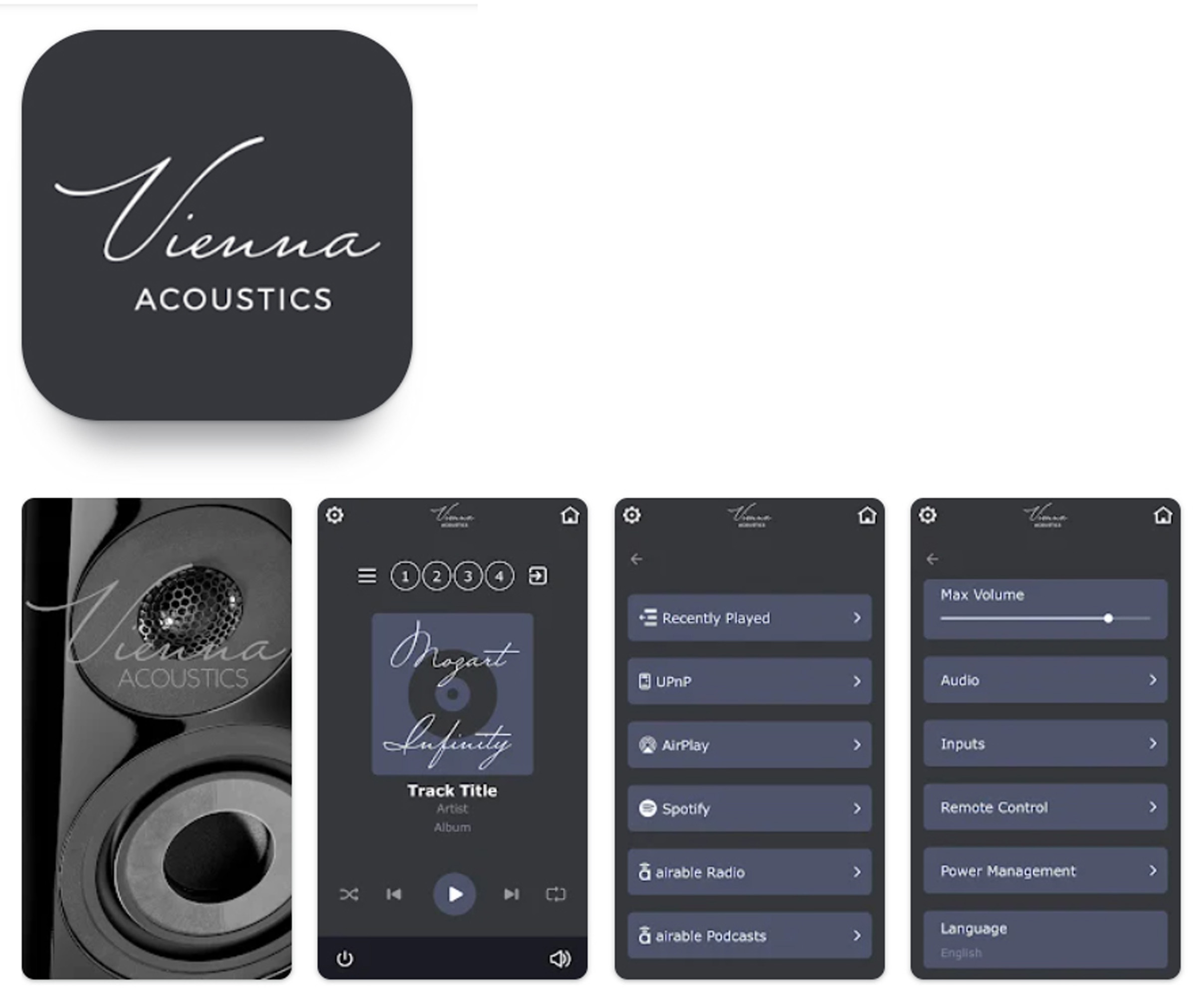 L’applicazione mobile proprietaria Vienna Acoustics fornisce controllo del sistema completo, inclusa la gestione dei servizi di streaming, regolazioni del tone control, selezione degli input e configurazione del livello di output massimo. Tre sensori touch capacitivi sul diffusore primario consentono il controllo diretto del volume, la selezione delle sorgenti e gestione della riproduzione senza dipendenza dallo smartphone.
