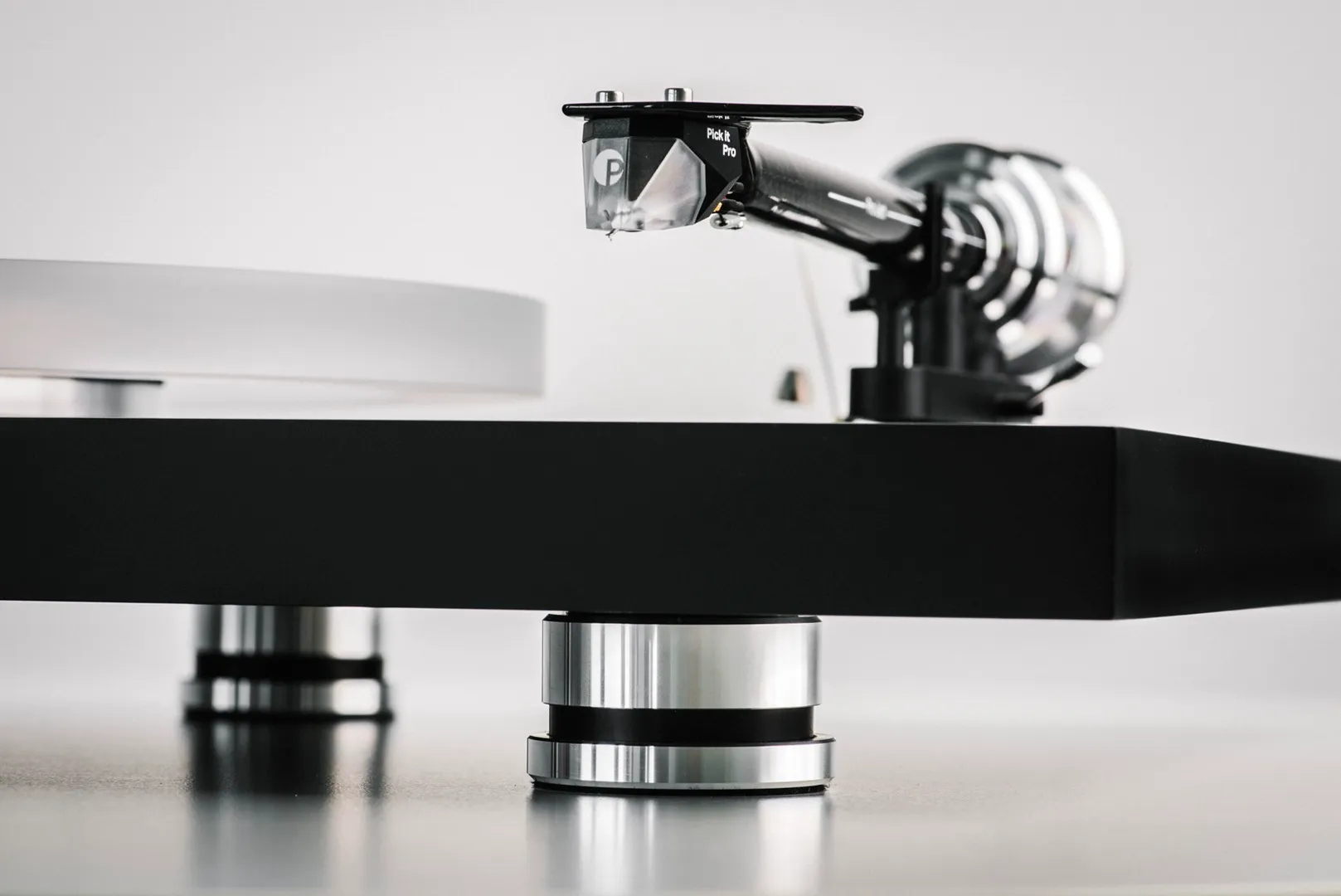 I tre piedini in alluminio smorzato, regolabili in altezza, completano il quadro meccanico: proteggono il giradischi dalle vibrazioni ambientali, riducono il rischio di retroazione acustica e permettono un livellamento preciso su qualsiasi superficie.